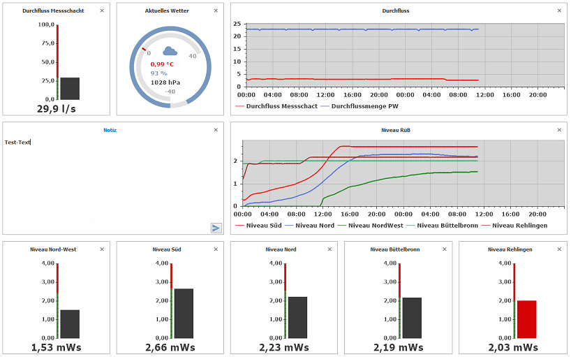 In AQASYS kann er sich alle wichtigen, aktuellen Werte auch übersichtlich als Dashboard anzeigen lassen. Die Gestaltung und bedarfsgerechte Anpassung der Grafiken und Dashboards kann er selbstständig in AQASYS vornehmen.