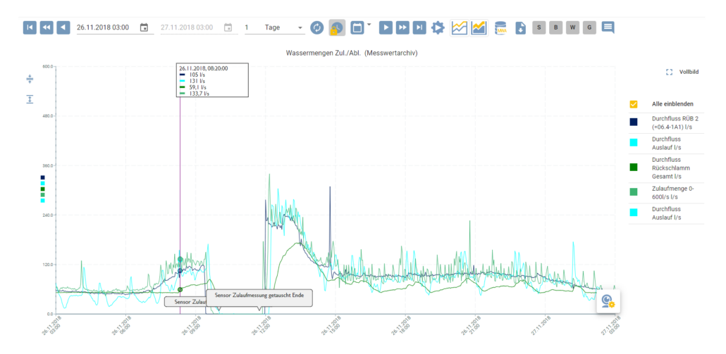 AQASYS speichert den Kommentar und zeigt diesen dann automatisch immer in der Ganglinie an, wenn die betroffene Variable und der Zeitpunkt enthalten sind – auf Wunsch bzw. Konfiguration hin können diese Kommentare auch in die Berichte übernommen werden.